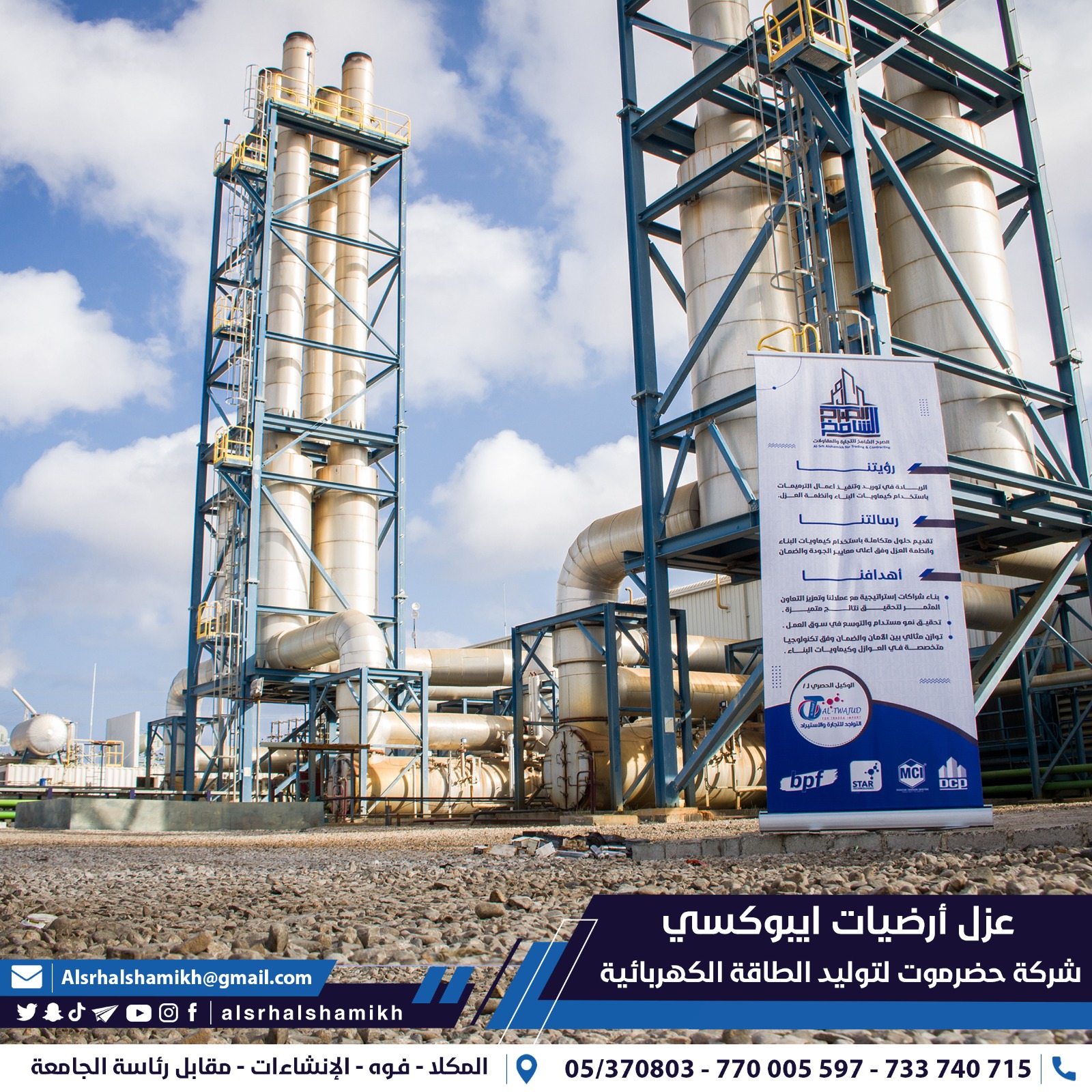 شراكة استراتيجية جديدة لتنفيذ أعمال العزل الصناعي والحماية لأرضيات وهناجر محطة التوليد التابعة لشركة حضرموت الاستثمارية بمساحة إجمالية تتجاوز 1600 متر مربع بأنظمة عزل متخصصة ايبوكسي مقاومة للمواد الكيميائية، الزيوت، والظروف التشغيلية الشاقة داخل محطات التوليد، بالإضافة الى عزل الهنجر بمادة اكريلك مع شبك الفايبر مما يعكس ثقة القطاع